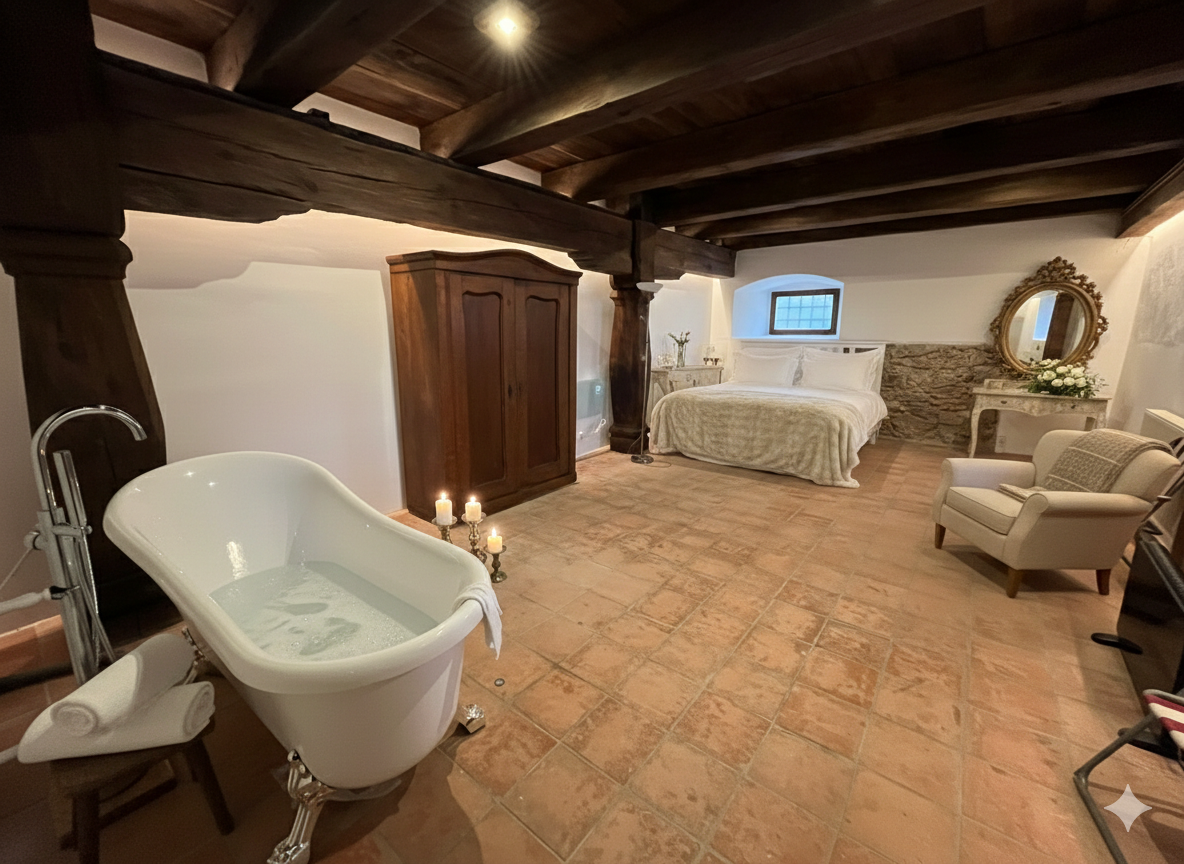 Začněte svou společnou cestu ve výjimečném stylu. Hned v přízemí sýpky pro vás chystáme luxusní novomanželské apartmá, které nabídne dokonalé soukromí a romantiku. Stylová vana na nožičkách, elegantní koupelna, měkké župany a voňavé toaletní potřeby. Samozřejmostí bude též WiFi připojení, fén na vlasy a vše, co potřebujete k dokonalému pohodlí.